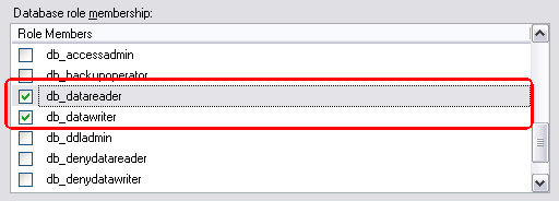 At the bottom half of the screen, you see a box labeled Database role membership. In this box, you can choose a number of roles that you want to grant to your new user. For this example, choose db_datareader and db_datawriter. For more details about configuring roles and permissions for other other objects like stored procedures, see steps 5 and 6 of scenario 1 earlier in this article.