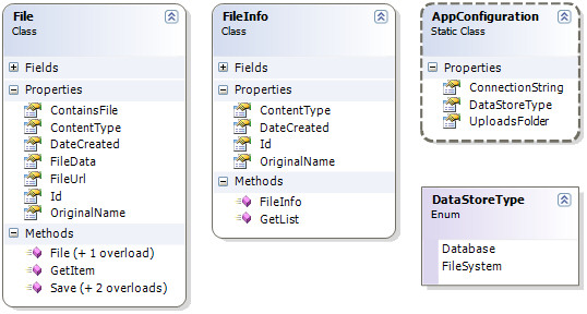 The File class represents an uploaded file and is used to store and retrieve uploaded files on disk and in a database. The database is used in both scenario's. Even when you decide to save the files on disk, some meta data of the file is still stored in the database. The File class has properties to store the ContentType of a file (like image/jpeg, application/msword etc), the date it was created (DateCreated), its unique ID in the database and the original name of the file when it was uploaded (OriginalName). It also contains a FileUrl which is used when files are stored on disk, and a FileData property which contains the actual file when it's retrieved from the database. The last property of the File class is ContainsFile, which indicates whether the file holds the bytes for the uploaded file in FileData, or that it contains a virtual path to the file on disk in FileUrl.