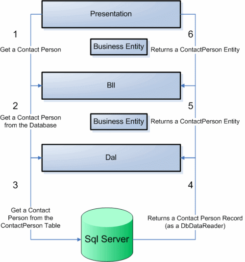 At the top of the figure you see the Presentation or UI layer, implemented as an ASP.NET web application. In the middle you see the Business Layer which contains two separate namespaces: the BO namespace (with classes that act as relatively dumb data containers, renamed to BusinessEntities in the new design) and the Business Logic Layer (BLL) — responsible for interacting with the UI and Data Access Layers). At the bottom you see the Data Access Layer (DAL) which is responsible for accessing the database.