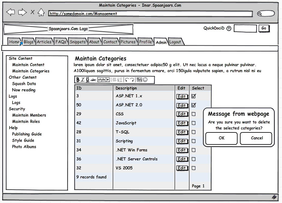 Which each of the tools I am reviewing, I am creating a mockup of the page in the Administration section of my web site that enables me to manage content categories. The page looks like this (click the image to get a bigger version):