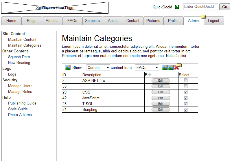 Which each of the tools I am reviewing, I am creating a mockup of the page in the Administration section of my web site that enables me to manage content categories. The page looks like this (click the image to get a bigger version):
