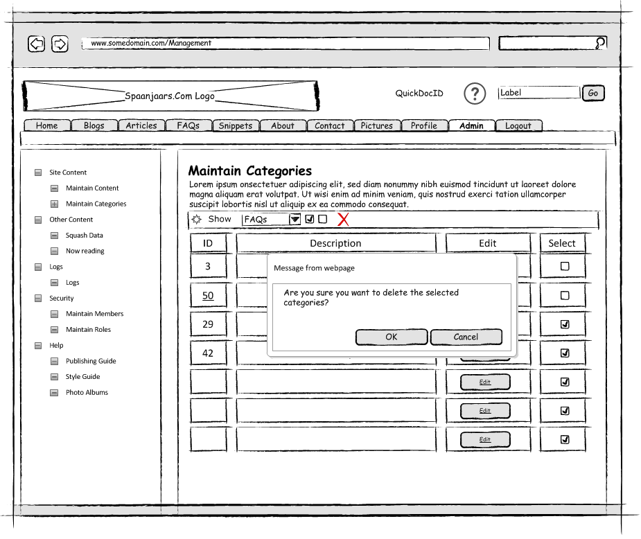 In addition to a static screen shot, you can also try out a live version of the Prototype here. On the first page you see the site map. You can click on the blue Manage Categories item to display the management section with the categories. Clicking on the Delete button on the toolbar pops up the alert box shown in Figure 5. Clicking OK or Cancel then takes you back tot the categories list.