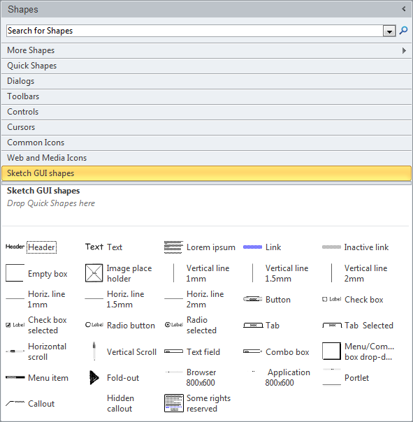 Figure 2 - The Shapes Panel in Visio 2010 Showing the Sketchy GUI Shapes