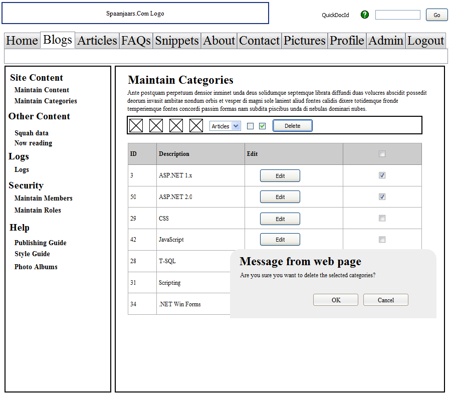 Which each of the tools I am reviewing, I am creating a mockup of the page in the Administration section of my web site that enables me to manage content categories. The page looks like this (click the image to get a bigger version):