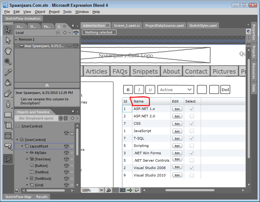 A great feature of SketchFlow is the ability to collect user feedback at presentation time. Users can annotate the design, add comments, highlight important elements and even draw additional UI on the canvas. This feedback can be exported and later imported in SketchFlow again so you get the user's feedback directly associated with the screen you're working on. You import the feedback on the SketchFlow Feedback panel (accessible through Window | SketchFlow Feedback) by browsing for a feedback file. Figure 1 shows a hand drawn box around the Name column together with a descriptive text in the Feedback panel on the left.