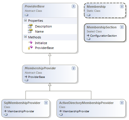 In short, this means that code in your web application talks to a known interface. Under the hood, the configured provider is instantiated and work is delegated to the underlying provider. So, for example, when you call System.Web.Security.Membership.CreateUser( ... ) to create a user, you talk to a static class (Membership) that delegates work to a provider it has access to (which is the System.Web.Security.SqlMembershipProvider class by default, but you can override that). The concrete implementations (SqlMembershipProvider in this example) inherit an abstract base class called MembershipProvider which in turn inherits an abstract base class called ProviderBase. It's this base class that is part of the key to implementing a provider based model. For the Membership services, the object model looks like this: