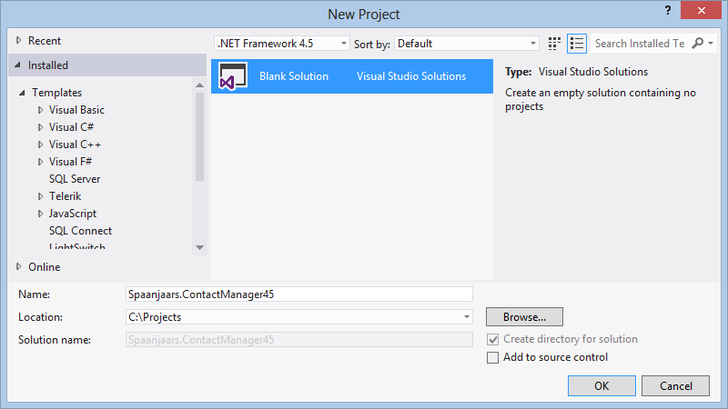 - In the Other Project Types category click Visual Studio Solutions and then click Blank Solution. As the name of the Solution, enter Spaanjaars.ContactManager45 and as the Location choose C:\Projects. Note: substitute Spaanjaars and ContactManager with your own company and project names.