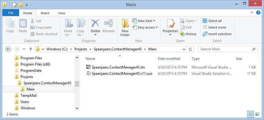 - Close Visual Studio and open the project folder (at C:\Projects\Spaanjaars.ContactManager45) in File Explorer (Windows Explorer on Windows 7 and earlier). Create a new folder called Main and then drag all of the Spaanjaars.ContactManager45.* files from C:\Projects\Spaanjaars.ContactManager45 into this new Main folder. Your structure now looks like this:
