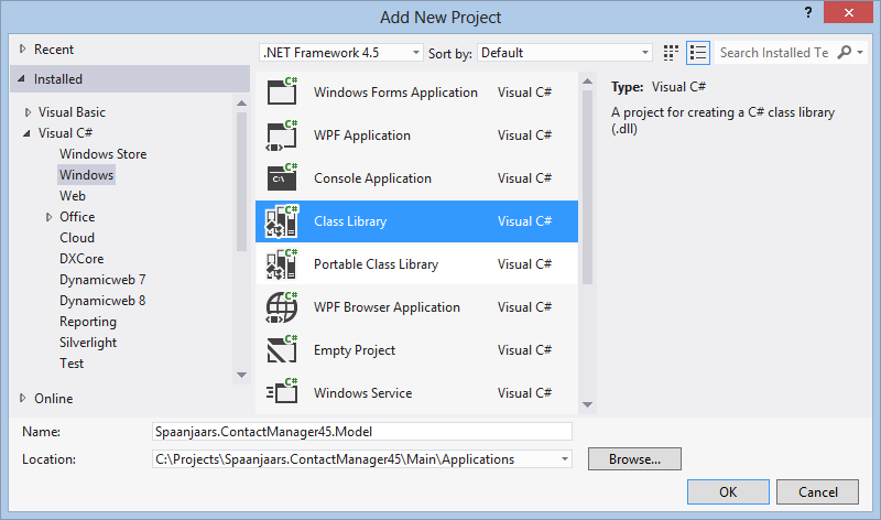 - As the name of the project, enter Spaanjaars.ContactManager45.Model.