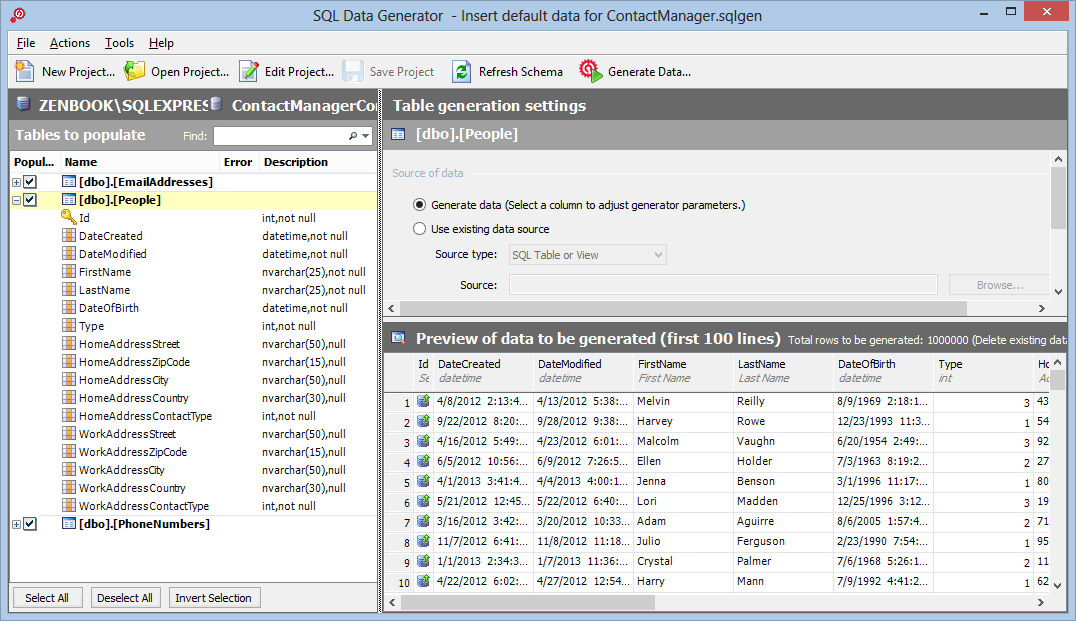 Using this tool, inserting a million rows in the People table takes less than a minute. With this large amount of sample data, I was able to find a few areas where I could improve performance. For example, if you sort the grid with all the people based on their ID, you’ll notice this is really fast as the ID has been set up as a (clustered) index as it’s also the primary key. However, when you try to sort on the full name of date of birth columns you’ll notice performance is not great. In this example it was easy to guess what the solution is - (add indexes for the first name, last name and date of birth columns to the database) but for more advanced scenarios having a good and large data set will help you find issues in your code and database. To make sure these indexes get added to the database even when it is regenerated after the model changes, you can execute the following code from a custom database initializer’s Seed method: