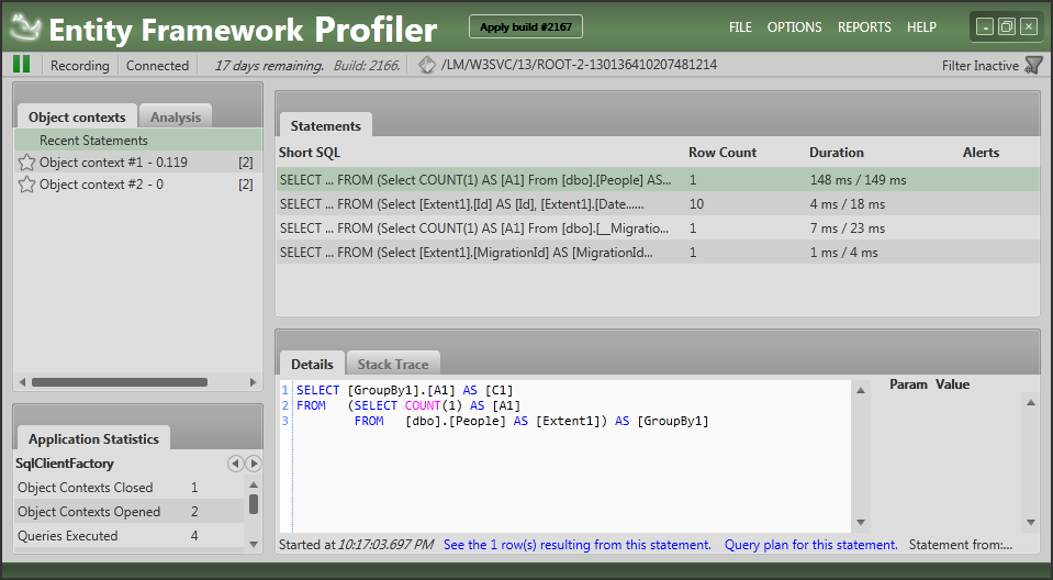 In order to see profiling data in the tool, you need to add a reference to the HibernatingRhinos.Profiler.Appender.dll assembly (from the EF Profiler directory) to the application you’re profiling. This can for example be your MVC or Web Forms project or your Integration tests project. See the file How to use.txt in the application’s main folder for more details about using the profiler in a production environment.