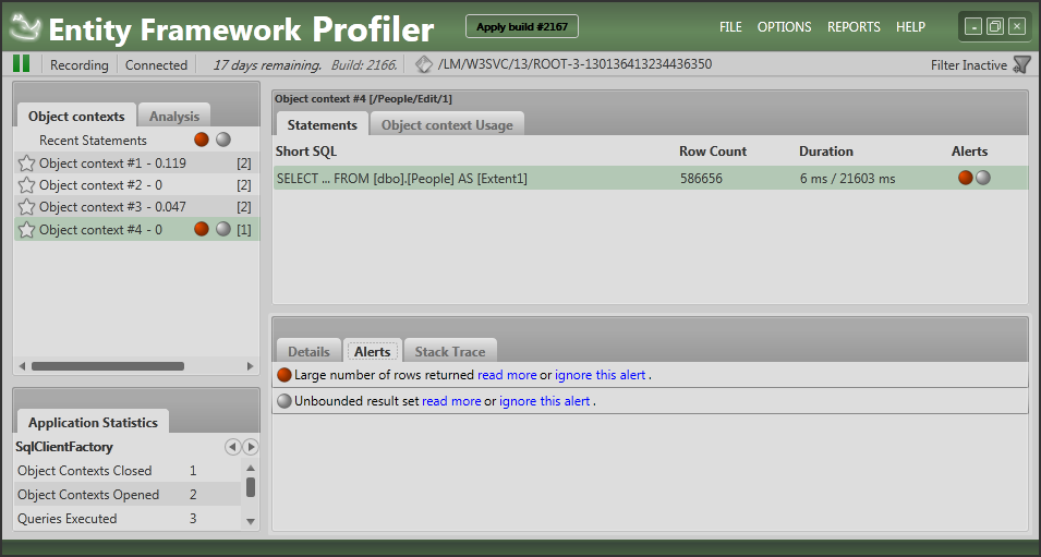 The profiler is flagging two issues. It has noticed that your query uses an unbounded result set and that a large number of rows are returned. The first issue is caused by the ToList method. This executes a query against the database without a WHERE clause, which means all rows are returned from the database. In this case, the second issue is a directly related to the first: since the table contains many rows and there is no restrictive WHERE clause, a large number of rows are returned to the calling application. You may also see these alerts independent of each other: if you query a large table with a WHERE clause that’s not very restrictive (for example Id > 1) you would still see the first alert. A small table that is being queried without a WHERE clause would cause the second alert to appear in the tool’s Alerts column.
