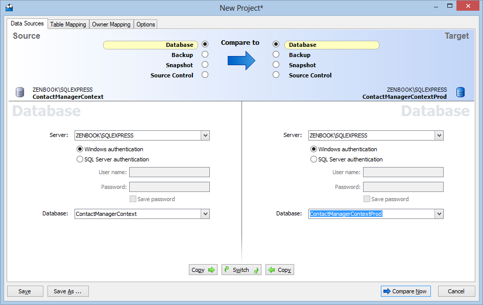 In order to compare the databases, you need access to both the source and target database from the machine that runs SQL Compare. For a production environment that may not be feasible. In that case, it’s recommended to restore a backup of production on your local or networked machine and use that for the compare operations.