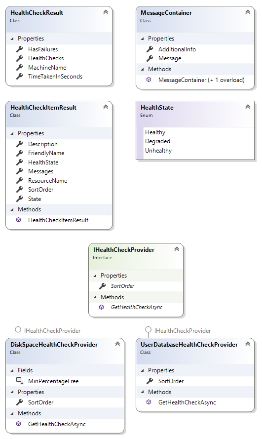 In my ASP.NET Framework projects I often implement health checks with some custom code. I usually have an IHealthCheckProvider interface that defines a single method to perform some kind of health check and then return the results to the calling code. Concrete classes then implement this interface. Next, to return the combined health status to the client, I create a result container DTO (HealthCheckResult) and a result class for individual health checks (HealthCheckItemResult). The container holds a list of results of the individual checks as well as some overall, machine-wide information. The following figure shows the overall class hierarchy of the solution: